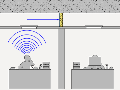 Painel acústico autoportante de lã mineral, composto por módulos de 1200x600x80 mm, revestido nas duas faces com um complexo kraft-alumínio, Euroclasse A2-s1, d0 de reacção ao fogo, como barreira acústica em plenums, entre a laje e a divisória. |