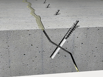 Colocação de injectores internos de polietileno cada 20 cm, em fissura de elemento de betão, dentro de furos de entre 6 e 25 mm de diâmetro, perpendiculares ao plano da fissura, dispostos em triângulo; e vedação superficial da fissura com adesivo tixotrópico de dois componentes à base de resina epóxi. |