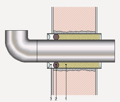 Selagem impermeabilizante exterior de junta perimetral de 15 mm de largura, entre negativo de PVC de 90 mm de diâmetro e conduta de instalações colocada no seu interior, com pasta monocomponente à base de poliuretano, sobre fundo de juntas para vedação em cordões de polietileno expandido, de 20 mm de diâmetro, colocado a uma profundidade de pelo menos 2 cm do bordo exterior do negativo que terá sido fixado previamente, com argamassa de cimento hidrófuga, no interior de uma abertura executada na parede de fachada até 40 cm de espessura e posterior injecção de espuma de poliuretano pelo interior contra o fundo da junta.