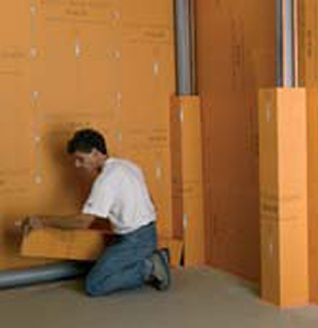 Sistema Schlüter-KERDI-BOARD "SCHLUTER SYSTEMS" de isolamento térmico de tubagens com painel suporte de espuma rígida extrudida. |