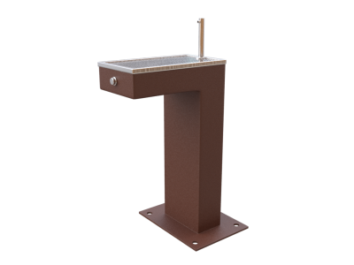 Fonte de 85 cm de altura, com corpo de chapa de aço zincado com protecção antioxidante e tinta de cor castanho, cano e pulsador de latão acabamento cromado mate e grelha e bandeja interior de aço inoxidável AISI 316L, colocação com aro de aço galvanizado e pernos de ancoragem. | ||