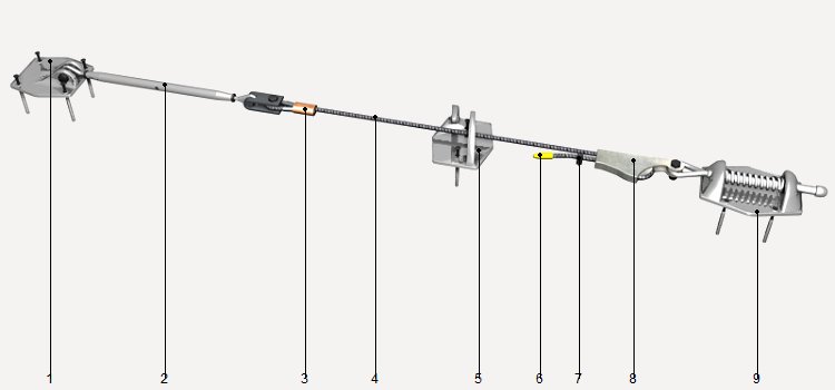 | Linha de ancoragem horizontal permanente, de cabo de aço, com amortecedor de quedas | ||