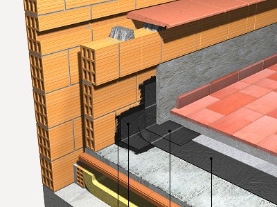 Encontro de cobertura plana acessível, ventilada, com pavimento fixo, tipo convencional com paramento vertical; através da realização de um afastamento perimetral de mais de 5 cm relativamente ao paramento vertical e mais de 20 cm de altura sobre a protecção da cobertura, enchimento com argamassa de cimento, confeccionada em obra, dosificação 1:8 colocada sobre a impermeabilização soldada por sua vez ao suporte e formada por: banda de reforço de 50 cm de largura, realizada a partir de membrana de betume modificado com elastómero SBS, LBM(SBS)-40-FP, com armadura de feltro de poliéster não tecido de 160 g/m², de superfície não protegida, totalmente aderida ao suporte com maçarico, prévia aplicação de primário com emulsão asfáltica aniônica com cargas. Remate com banda de acabamento de 50 cm de desenvolvimento com membrana de betume modificado com elastómero SBS, LBM(SBS)-40-FP, com armadura de feltro de poliéster não tecido de 160 g/m², de superfície não protegida, acabamento com um revestimento de rodapés de grés rústico, de 7 cm, 3 €/m colocados com junta aberta (separação entre 3 e 15 mm), em camada fina com cimento cola de presa normal, C1 sem nenhuma característica adicional, cor cinzento e enchimento de juntas com argamassa de juntas cimentosa melhorada, com absorção de água reduzida e resistência elevada à abrasão tipo CG 2 W A, cor branco, para juntas de 2 a 15 mm, formação de ventilação perimetral da caixa de ar com tijolo cerâmico furado, e colocação de remate inferior cerâmico de 11x24 cm, fixado ao paramento, como remate da ventilação perimetral da caixa de ar.