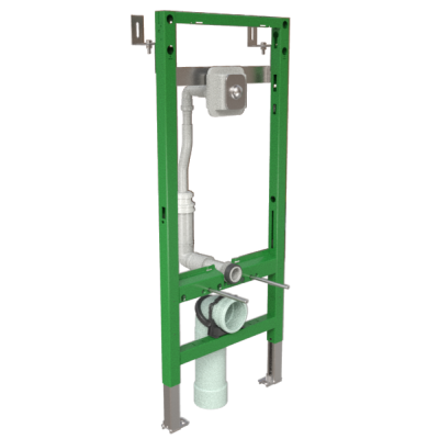 Fluxómetro, com descarga regulável entre 6 e 9 litros, sobre estrutura pré-montada, de 1130 mm de altura e 500 mm de largura, de aço com revestimento anticorrosão, com pés de apoio reguláveis em altura até 200 mm, para sanita suspensa, com ligação a abastecimento, válvula de corte, tubo guia para tubo de alimentação de aparelhos sanitários, joelho de descarga de polipropileno de 90 mm de diâmetro, adaptador de polipropileno, varões roscados para suporte de sanita e elementos de fixação, com conjunto de ancoragens de parede, ajustável em comprimento entre 130 e 230 mm e placa de comando anti-vandalismo para acionamento de fluxómetro, de aço inoxidável, de descarga única, de 156x197x19 mm, com aro de fixação. Instalação encastrada em parede de alvenaria.