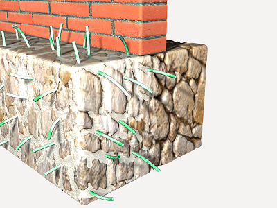 Leitada de cimento à base de água e argamassa seca de retracção compensada, injectada à pressão através dos vazios existentes em fundação de alvenaria de pedra em seco, brita ou entulho, incrementando a sua capacidade de carga, em reforço de fundação. | ||