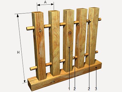 Cerca de madeira de pinho tratada em autoclave com sais hidrossolúveis, com classe de risco 4 segundo NP EN 335, formada por montantes rectangulares de 7x7 cm e 120 cm de altura separados 25 cm entre si, travados com toros torneados de 8 cm de diâmetro e apoiados sobre base realizada com travessas de 20x10 cm, fixada à fundação com parafusos estruturais de aço zincado. | ||