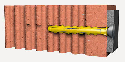Ancoragem mecânica com bucha de nylon e parafuso de aço galvanizado, de cabeça escareada, para fixação de elemento não estrutural a parede de alvenaria.