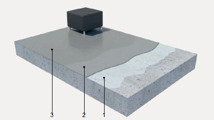 Revestimento de pavimento industrial, realizado sobre base de betão endurecido, com o sistema Weberfloor Design "WEBER", apto para habitações, em interiores, através da aplicação sucessiva de: primário regulador da absorção, Weberprim TP05 "WEBER"; camada base de 10 mm de espessura com argamassa autonivelante polimérica colorida Weberfloor Design "WEBER", CT - C30 - F7 - RWA1 segundo EN 13813, de cor cinza, aplicada manualmente; e camada de vedação com verniz de poliuretano alifático, Weberfloor Aqua Protect 2C "WEBER", bicomponente com base aquosa, sem dissolventes, acabamento acetinado, aplicada em três demãos. | ||